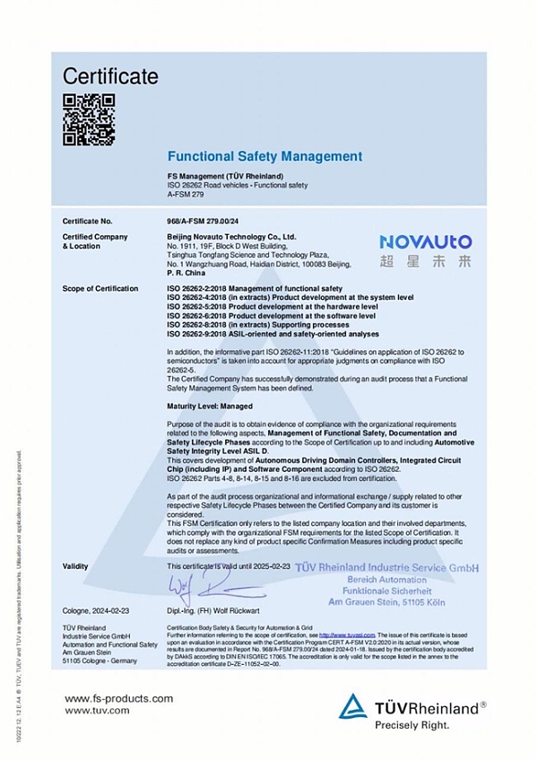 近日,独立第三方检测、检验和认证机构德国莱茵TÜV集团(以下简称“TÜV莱茵”)正式向超星未来颁发 ISO 26262 功能安全管理体系 ASIL D 认证证书。与此同时,超星未来 7 名骨干以 100% 的通过率通过了功能安全工程师认证。