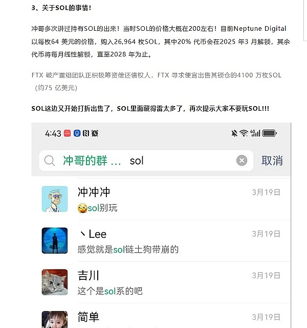 再来看看冲哥的公开提示:3.25还有4.6日都多次提示不要玩SOL,不要碰!!!
