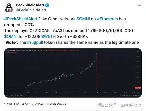 与此同时,使用相同代码的假 OMNI 代币的开发者发起了价值 398,000 美元的诈骗。区块链安全公司PeckShield在 4 月 18 日的帖子中写道,部署智能合约后,超过 1.7 千万亿代币被抛售,换取 132 个 Wrapped Ethereum (WETH),导致假代币价值下降 100%。