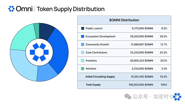 OMNI供应量的最大部分(29.5%)将分配用于生态系统开发,最初由区块链支持公司 Omni 基金会酌情分配。OMNI 供应量的近四分之一(2330 万枚代币)分配给了投资者和顾问。