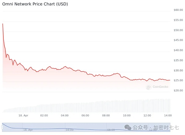 半小时内,OMNI 从 53.80 美元下跌约 30% 至 39 美元以下,并继续跌破 24 美元,跌幅超过 55%。根据 CoinGecko 的数据,OMNI 目前的市值为 2.675 亿美元,完全摊薄后的估值约为 25.7 亿美元。