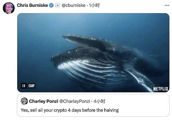 Burniske 在社交媒体X发文表示:「市场存在着显著的恐慌情绪,而价格在合理区间内站稳了脚跟,过度的波动得到消除,这将是价格最终上涨的基础。」此外,Burniske 还转发了一则关于「你们居然会在减半前 4 天清仓」的推文,并配以鲸鱼吞食的图片,或暗指巨鲸正在低价吃掉散户恐慌抛售的筹码。