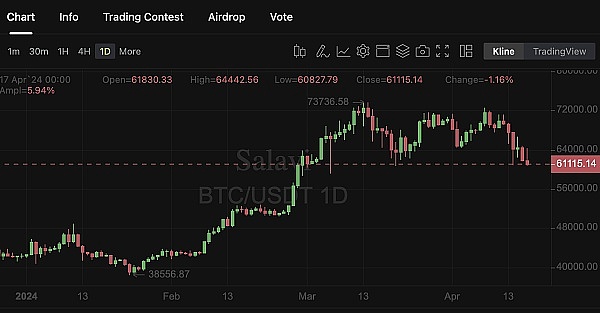 4月14日,BTC价格大幅跳水,直接从4月13日近 70,000 万美元的高价下跌至 60,000 美元,下跌幅度超 14 个点,很多用户前段时间屯的现货赚来的收益一夜之间大幅缩水,甚至出现亏损情况。本轮 BTC 减半还剩不到1天时间,行情能否如大多数期盼的那样,出现新一轮牛市呢?