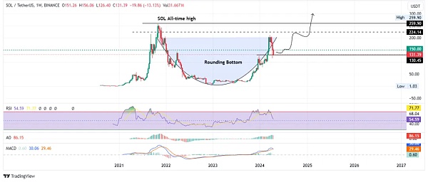 Solana 价格已屈服于大盘暴跌,在过去 7 天内下跌了 24%。然而,从技术角度来看,Layer 1 (L1) 代币已经完成了圆底模式。此前,L1 代币从 2021 年 11 月开始到 2023 年 1 月经历了长期下跌,暴跌 98%。随后是一段短暂的横向盘整,之后多头占据主导地位,Solana 价格开始上涨。至此,价格走势完成了圆底形态。