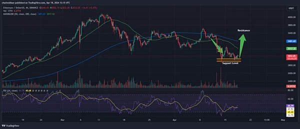 以太坊的价格已从 3718 美元的峰值跌至 2956 美元的支撑位,目前保持稳定。尽管多头一直试图推高价格,但空头却表现出了力量,再次压低了价格。这形成了一种看起来像双底的模式,表明可能转向看涨趋势。