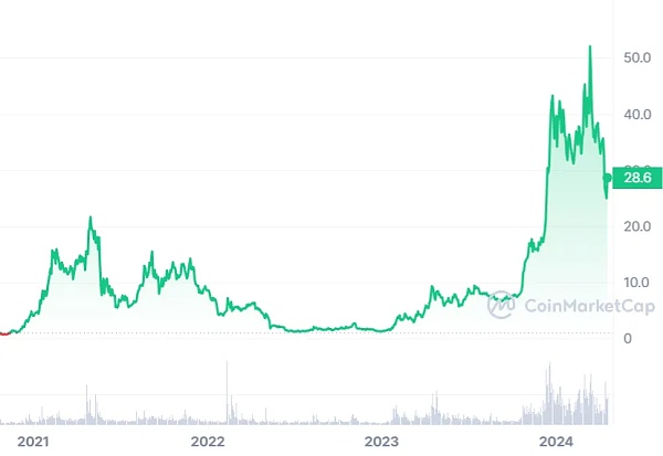 今天注射剂的价格上涨了 15% 以上,在撰写本文时其价格为 28 美元。 INJ 也是牛市中加密货币涨幅最大的股票之一,在趋势顶峰时涨幅超过 400%。投资者称赞该代币是表现最好的代币之一,其价格从 10 月份的约 9 美元攀升至 3 月份的约 55 美元。