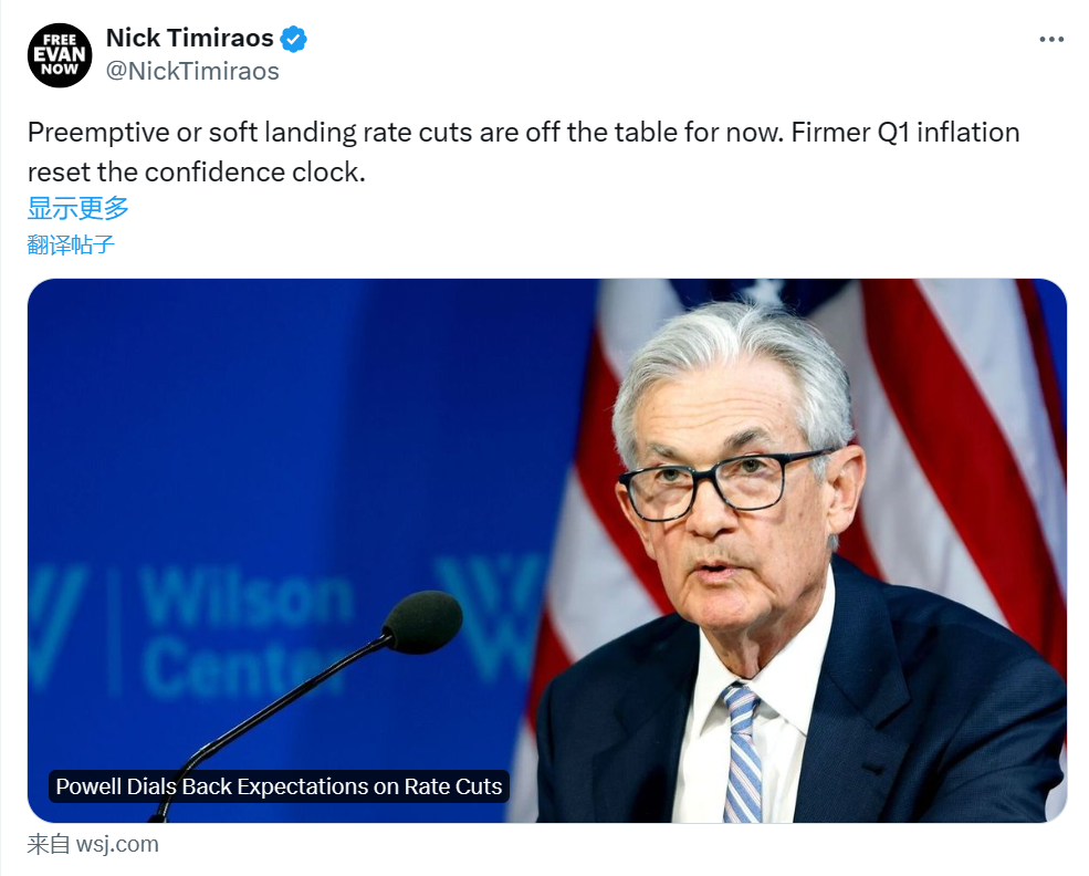 更为关键的是,在本周鲍威尔的讲话中,他也表示通胀缺乏进一步进展,让高利率在更长时间内发挥作用可能合适,而一直被视为「新美联储通讯社」的华尔街日报记者 Nick Timiraos 对此点评称,美联储前景展望发生明显转变,这似乎打破了他们可能「先发制人」降息的希望。