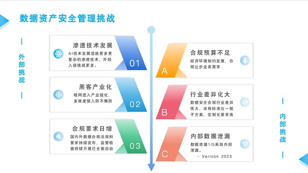 在内部方面,挑战主要涉及合规预算不足、内部信息泄露等问题。由于安全预算的不足,许多企业在数据安全方面的投入不能够满足日益增长的安全需求,导致安全防护水平的下降。另外,内部信息泄露也是一个严重的问题,其中一部分可能是无意识地泄露,而另一部分可能是有意识地泄露,这对企业的声誉和利益都造成了严重的损害。