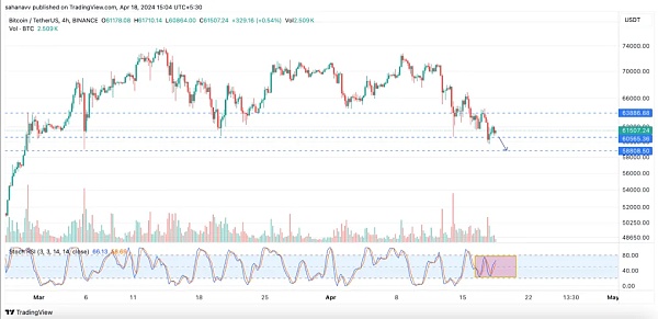 短期价格分析显示,价格处于陡峭下降趋势的中间,最后一次向低点推进可能会导致价格跌向较低的支撑位 58,800 美元。4小时图中的随机RSI已在阻力位和支撑位之间受到挤压,这表明多头和空头力量显着下降。因此,这证实了看跌的说法。