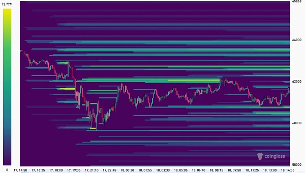 比特币的清算热图显示,在 60,758 美元附近形成集群,后来在 60,475 美元附近形成集群,目前已放置近 5581 万美元和 5535 万美元的空头。有趣的是,在 62,063 美元和 62,119.86 美元处形成了类似的集群,当 BTC 价格达到这些价格水平时,有超过 1.2 亿美元被清算。然而,下一个阻力位可能在 62,500 美元至 62,700 美元左右,其中有超过 1.1 亿美元。