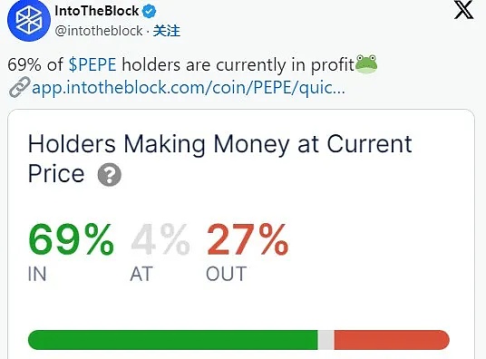 根据IntoTheBlock的数据,目前有69%的PEPE持有者处于盈利状态,即他们“赚钱了”。随着分析师密切关注Pepe的表现,预计其价格将出现大幅波动,因此有人猜测Pepe可能会跌破零,以触及新的阻力位。这样的预测增加了市场的热情,投资者和粉丝都在热议代币的价格走势。