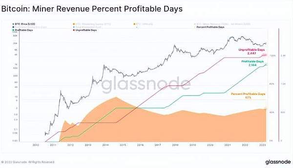 根据 Glassnode 在 3 月 24 日的报告,自 2010 年以来,矿工已经经历了长时间的不盈利时期,只有 47% 的交易日是盈利的。