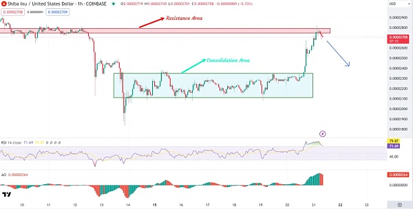 然而,空头可能会利用超买区域的 RSI 交易来推动价格在修正状态下下跌。这可能会迫使多头回撤至 0.00001752 美元的支撑区域,与 50 SMA 重合。