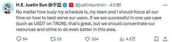 波场TRON创始人孙宇晨在社交媒体表示:无论我的日程有多忙,我和我的团队都应该把所有的时间集中在如何更好地服务用户上。如果我们在一个用例中取得了成功(比如波场版USDT),那我们应该集中资源,努力在这个领域做得更好。