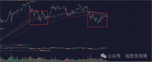BTC在周末持续震荡,价格围绕在64700附近波动。在4小时级别K线上形成了头肩底的形态,但总体趋势仍然处于71000至60000的区间震荡之中。与3月20日的形态相似,今天的重点关注点在于能否突破66800的压力位,若能突破,则有望继续反弹。ETH方面,继续看震荡向上的走势,特别关注在3200附近的压力位。至于山寨币,周末出现了集体上涨,符合之前的预期。这可以视为完成了第一波涨幅,但尚未触及压力位,因此继续看涨。如果你手头的币种没有出现反弹,建议继续等待,不要在追高上,因为最近山寨币的走势是反弹性质的,追高可能会被短暂套牢。