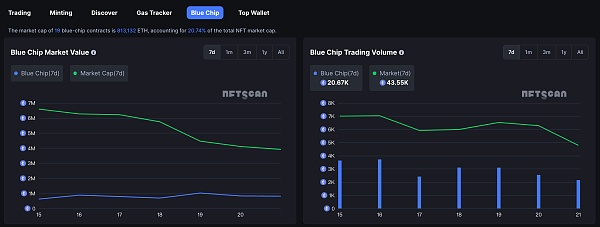 当前 19 只蓝筹合约总市值为 813,132 ETH,占 NFT 总市值的 20.74%。