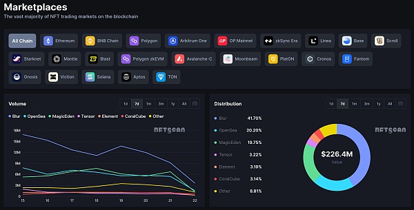本周:大部分交易市场走势较为平缓,Blur 占市场主导,整体交易额在 4 月 15 日达到最高,0:00 时 Blur 市场最高达 1687.8 万美元,NFTScan 收录 228 个交易市场 7d 总交易额达 $226.4m。本周 Blur 交易额排名第一,市场交易额分布较稳定,排名前六的交易市场及占比分布: