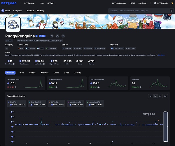 目前 NFTScan 显示, Pudgy Penguins 目前地板价稳定在 11 ETH,最高成交价 420 ETH,7d 交易额为 5k ETH 左右,目前以太坊上总交易额已超 373.9k ETH,过去 7 天交易分布主要为 Blur: 4.79k(95.74%),Opensea: 179.56(3.56%),X2Y2: 12.9(0.26%),MagicEden: 10.45(0.21%),LooksRare:10.04(0.20%)单位 ETH,7d 交易笔数达 548 次。