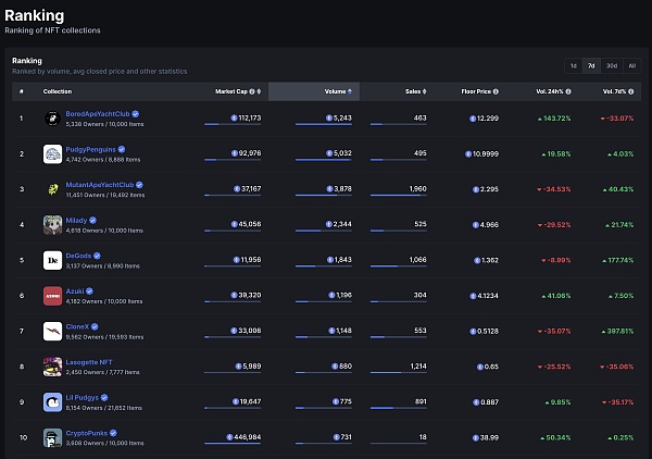 本周 BoredApeYachtClub 位列第一,地板价于上周已回升至 12.299e 左右,7d 交易额达 5,243e;Pudgy Penguins 以 5,032e 的交易额位列第二,目前地板价为 11e;Milady 以 2,344e 的交易额位列第四,目前地板价为 4.96e; 大部分蓝筹 NFT 整体市场交易额和地板价呈下跌趋势。