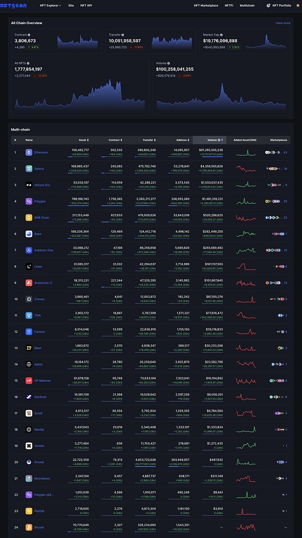 截至 2024 年 4 月 22 日,NFTScan 目前已支持 Bitcoin、Ethereum、BNBChain、Polygon、Solana、Avalanche、Arbitrum、Optimism、zkSync、Starknet、Aptos、Mantle、Linea、Base、TON、Blast、Scroll、Viction、Fantom、Polygon zkEVM、Moonbeam、PlatON、Cronos、Gnosis 24 条主流区块链网络,共产生: