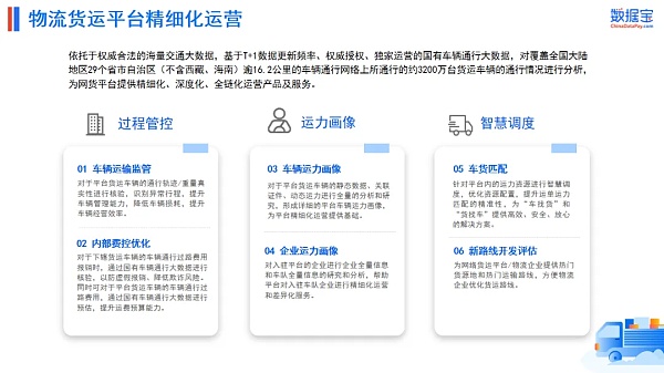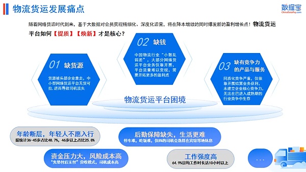 物流货运发展痛点包括缺货源、缺资金、缺有竞争力的产品与服务等问题。为解决这些痛点问题,数据宝依托大数据赋能创新应用,打造物流——网络货运平台产品服务,实现网络货运平台的优化和外部利益增长点的创造。