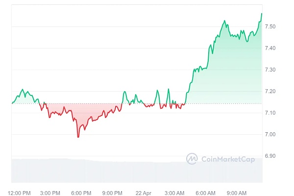Polkadot 最近从低迷中恢复并突破 7.00 美元大关,展现了韧性。目前交易价格为7.51美元,盘中涨幅为4.65%,交易量为5.0856亿美元。此外,其交易价格高于 200 日简单移动平均线,暗示潜在的上升趋势。