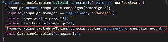 cancelCampaign函数会将存入的Token提取出来,但却并没有取消代币的批准。