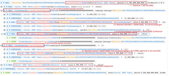 在该交易中,攻击合约将保存在ClaimCampaigns合约中的1.305M USDC提取走后,ClaimCampaigns合约批准给攻击合约的1.305M USDC并没有取消,因此攻击合约可以直接调用USDC的transferFrom函数再次从ClaimCampaigns合约中转移走1.305M USDC。这也是交易0xa17fdb804728f226fcd10e78eae5247abd984e0f03301312315b89cae25aa517实现的功能。