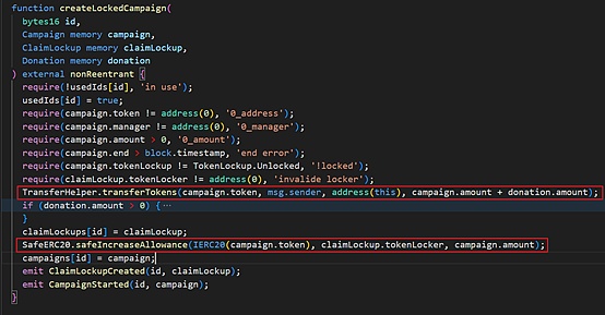智能合约ClaimCampaigns的createLockedCamaign函数会将msg.sender的Token存入到目标合约中,并将这些Token批准给msg.sender。