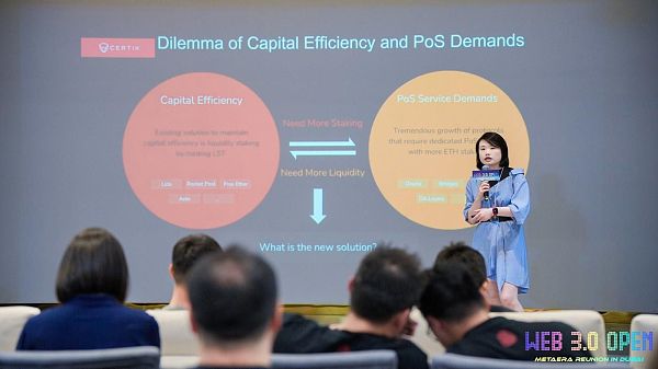 CertiK 解决方案架构负责人 Connie Lam 女士发表了题为「深度解析 Web 3.0 行业的安全挑战」的主题演讲。Connie Lam 指出,加密市场的风险承担市值正在不断增长。从今年一月的 11.4 亿美元飙升至上周的 128.4 亿美元。这种增长归因于资本效率的提高,通过将更多的代币锁定在生态系统中,加强了资本利用效率。然而,该市场也面临着新的挑战,其中之一是对 PoS 服务需求的减少。为了解决这一问题,CertiK 提出了再抵押中间件的概念,通过智能合约、验证机构和运营方之间的协同工作,将本地 ETH 分配到不同的服务和用户部分。