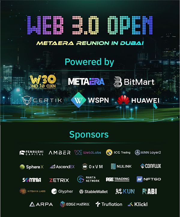 由 Web 3.0 Open、Meta Era、BitMart、CertiK、WSPN 及 Huawei Cloud 联合主办,分布式资本、Amber Group、Web3Labs、ICG Trading、AINN Layer2、SphereX、AscendEX、0xVM、NuLink、Conflux、Somnia、Zetrix、Manta Network、PSE Trading、NFTGO、Kitsaya Labs、Glypher、StableWallet、鲲KUN、Rabi、ARPA Network、Edge Matrix、Truflation、Klickl 赞助的「Web 3.0 Open - Meta Era Reunion in Dubai」于 2024 年 4 月 20 号在迪拜盛大召开并圆满落幕。