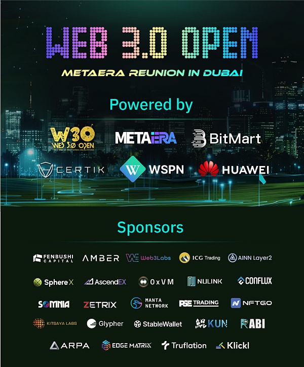 由 Web 3.0 Open、Meta Era、BitMart、CertiK、WSPN 及 Huawei Cloud 联合主办,分布式资本、Amber Group、Web3Labs、ICG Trading、AINN Layer2、SphereX、AscendEX、0xVM、NuLink、Conflux、Somnia、Zetrix、Manta Network、PSE Trading、NFTGO、Kitsaya Labs、Glypher、StableWallet、鲲KUN、Rabi、ARPA Network、Edge Matrix、Truflation、Klickl 赞助的「Web 3.0 Open - Meta Era Reunion in Dubai」于 2024 年 4 月 20 号在迪拜盛大召开并圆满落幕。