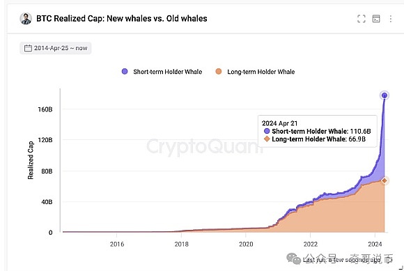 CryptoQuant 首席执行官 Ki Young Ju 表示,新鲸鱼对比特币的初始投资几乎是老鲸鱼累计投资总额的两倍。长期持有者正在获利了结,并且随着越来越多的钱包获利,长期投资者利用价格上涨来实现利润的可能性足够高。