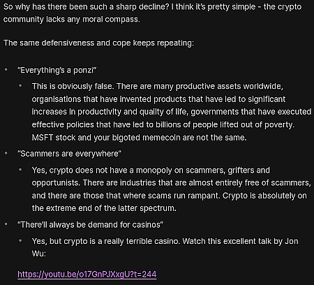 我个人的道德准则之一是:"如果有一类你不喜欢的人或团体,要愿意表扬其中至少有几个最能满足你价值观的人"。如果你不喜欢ZF因为它们侵犯人们的自由,也许你可以在心中留出空间,对一些尽最大努力尊重个人自由的ZF说点好话。同样,对于加密货币的爱好者来说,承认一些代币项目的积极努力也是合适的。