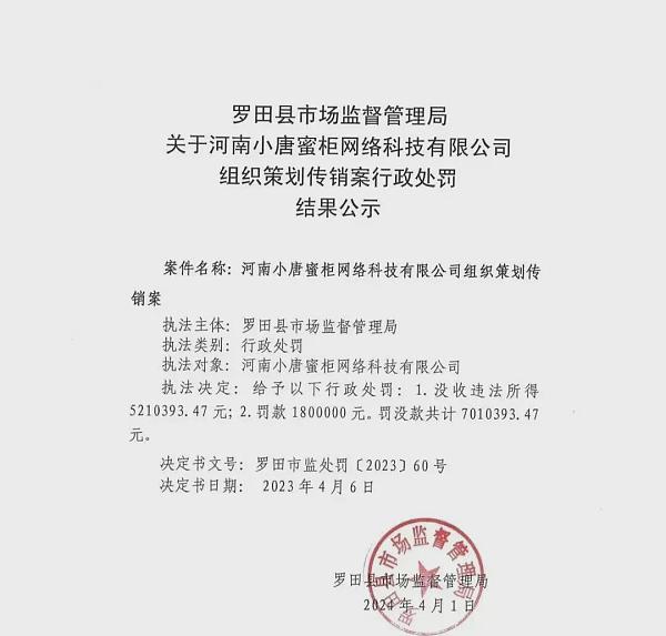 去年被多地行政立案调查的小唐蜜柜的第一份行政处罚结果公布,被罚没700多万,2023年初,这个小唐蜜柜以投一万每天返五十五的模式在多地推广,短时间内就将这个东西在大江南北快速布局,然而好景不长,三个月后就被多地监管部门查处,账户被冻结,现在已经彻底凉凉,投资者的钱也拿不回来了。