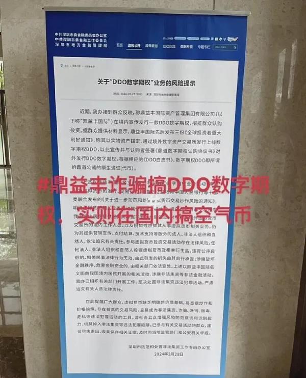 鼎益丰高层现在也是树倒猢狲散,都在自寻出路,有几个自己搞出来一个DDO数字期权,打着隋老道的旗号让韭菜继续投钱,然而这个DDO数字期权光有个数字,根本卖不出去,现在又被预警,再次爆雷,留下的那些业务员就惨了,现在天天投资者被堵门追讨血汗钱。