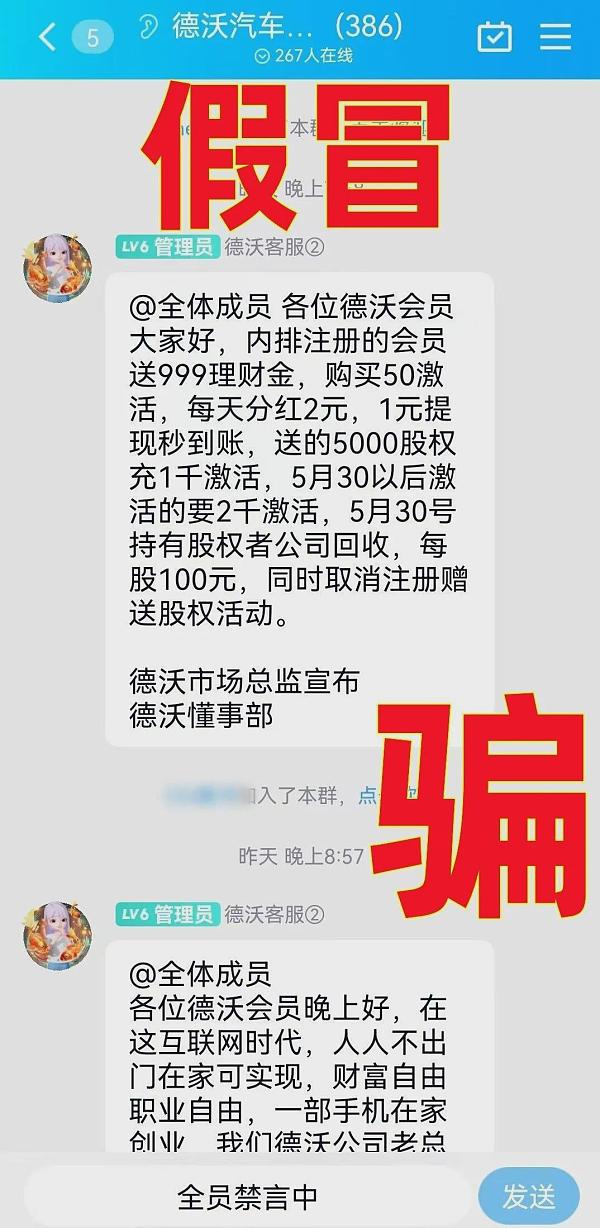 假冒的“德沃汽车”app是假冒福州德沃汽车服务有限公司的诈骗平台,是杀猪盘,去年就出来骗了不少钱跑路了,估计这钱很好骗,现在又出来骗钱来啦,如果谁还相信这个平台是真的,先查查收款账户,不是福州德沃汽车服务有限公司的账户收款,还相信这是真的平台,请打电话给福州德沃汽车服务有限公司核实一下,别稀里糊涂的中了骗子的圈套!