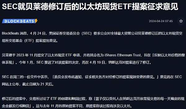 美SEC就贝莱德现货以太坊ETF修正案公开征求意见,要求21天内提出意见,目前美国除了SEC反对之外,其他部门和机构都支持审批通过,所以5月份,以太坊现货ETF大概率会通过