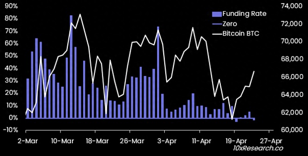 10x Research发布分析文章指出,自2023年10月中旬以来,资金利率首次转为负值,关键时刻即将到来。比特币在四天内从60,000美元反弹至67,500美元,然而,比特币的反弹发生在四个一小时的时间周期内,似乎是由几笔较大的订单推动的,而不是四天内逐步买入。由于加密货币期货交易者已转为谨慎,真正的考验是现货市场能否推动这轮反弹走高。