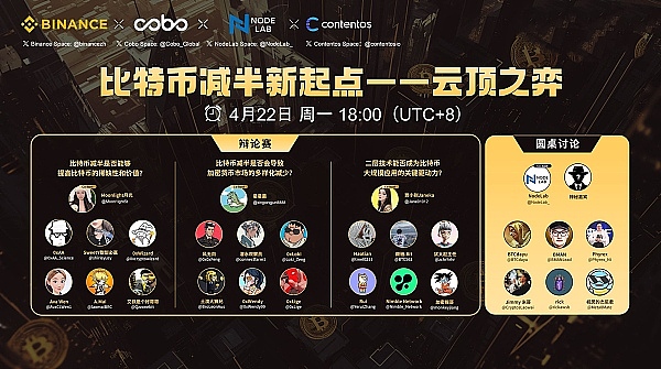 4月22日,在Twitter平台举行的由Binance联合Cobo,Nodelab和Contentos主办的《比特币减半新起点一一云顶之弈》AMA活动聚焦于比特币减半事件对其价值及市场影响的探讨,通过一系列辩论和圆桌讨论,行业OG分享观点,论述减半如何影响比特币的稀缺性、市场多样性以及其技术发展。活动旨在提高公众对加密货币未来趋势的认识,促进对行业动态的深入讨论和理解。