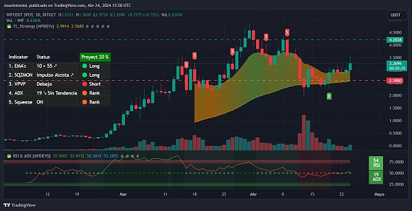 尽管 Dogwifhat 在 4 月初出现了 50% 的回调,但整体看来仍看涨。 EMA10 和 EMA55 之间的差距正在扩大,这意味着价格随着时间的推移而加速。挤压动量指标显示趋势正在逆转,交易者在价格调整后重新购买代币。
