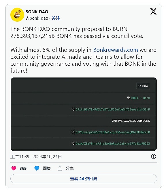 飙升之际,Bonk DAO 批准了一项销毁超过 2780 亿个 BONK 代币的提案,其中价值超过 620 万美元的 $BONK。社区投票最终以 418,625,159,192 票赞成,支持率高达 99.9%。代币销毁通常被认为是看涨事件,因为它减少了流动性并使代币变得更加稀缺。