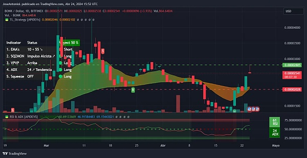 乐观情况下,如果BONK能够维持势头,那么可能会测试0.000028美元附近的新阻力,下一个目标是0.000037美元。然而,悲观的情况预计代币将出现炒作后修正,达到 0.000020 美元,这是一个明显的支撑,也是 EMA10 和 EMA55 之间的拐点。