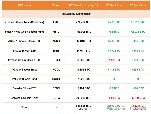 通过现货比特币交易所交易基金(ETF)增加机构采用将推动这一预期的很大一部分。截至 4 月 24 日,Lookonchain 数据 显示 ,GBTC 减少了 538 BTC,而贝莱德和其他现货 ETF 发行人增加了 569 BTC。