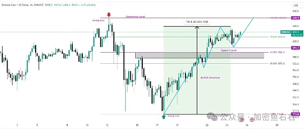 BNB 代币在 4 小时图表上展现出看涨模式,其特点是新高超越先前高点且旧低保持稳定的一致轨迹。正如价格范围工具所示,这一积极势头得到了较一周前确定的近期波动低点上涨 20.6% 的支撑。
