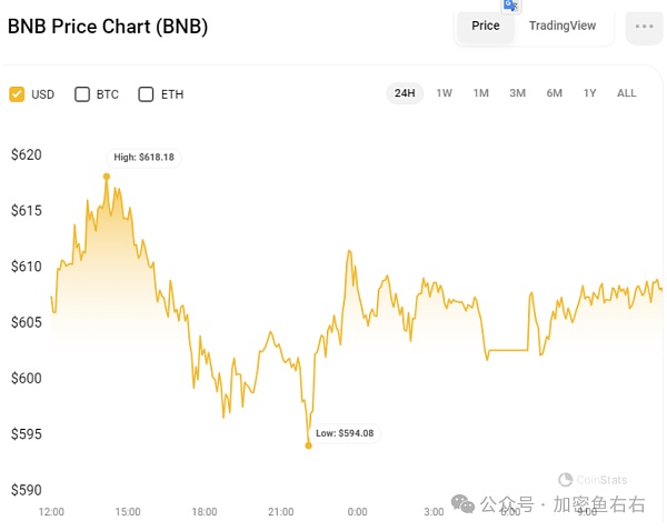BNB价格一周上涨11.57%,最高触及615.38美元。
