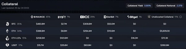 而 Ethena Labs 官网数据显示,USDe 的比特币抵押资产总价值超 8 亿美元,以太坊头寸超 10 亿美元,累计占比近 8 成。