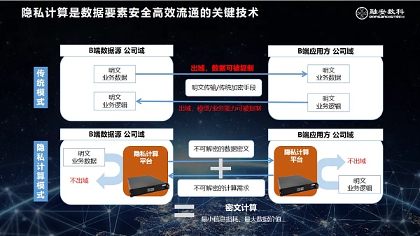 数据可复制的特点造就了数据的两面性,一方面有利于数据开发利用,另一方面加大了数据保护的难度。在传统的数据流通模式下,数据提供方以及数据应用方都需要在明文的形式下做计算,容易造成数据泄露,在加入隐私计算之后,双方只需要在密文的情况下做计算,数据安全便可以得到保障,价值也可以得到有利的发挥。