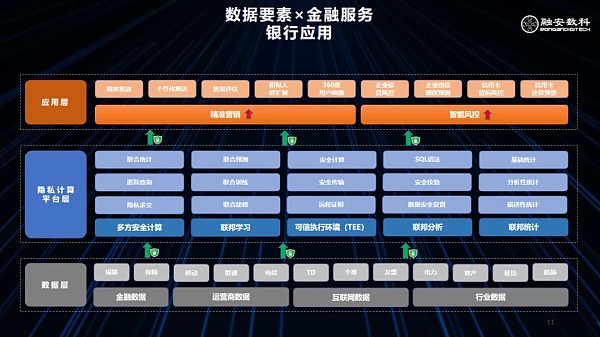 融安数科的隐私计算驱动数据要素在金融、医疗、能源等领域均有应用和实践。在金融领域,融安数科基于隐私计算引入第三方数据源,在银行精准营销以及智能风控等应用场景中,实现精准投放、个性触达等功能。