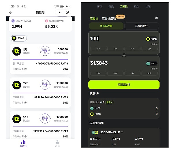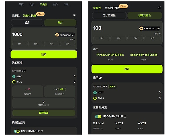LP奖池主要回馈社区生态流动性提供者,用户在RWA Finance官网流动性资金池按一定比例注入RWAS和USDT资产,即可成为流动性提供者,获得高额奖励。